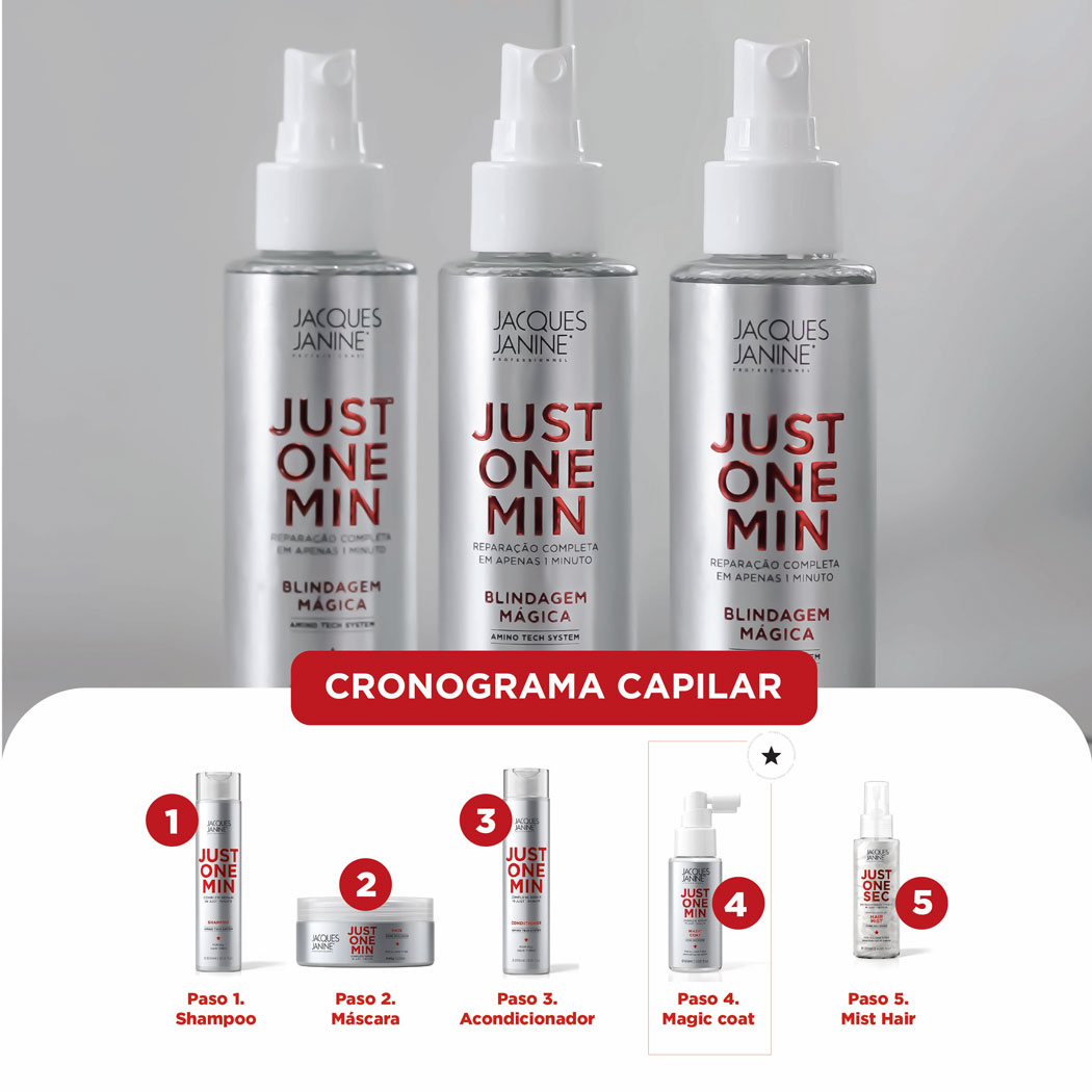 Después de lavarte el cabello con el Shampoo, Mascarilla y Acondicionador Just One Minute, aplica el Magic Coat en tu cabello húmedo. Divide tu cabello en secciones y rocía generosamente. Peina el cabello para distribuir el producto uniformemente. Paso esencial, Activa el producto con una fuente de calor, puede ser cepillo secador o secador, estirando los cabellos. Para un mejor resultado finalice con plancha.